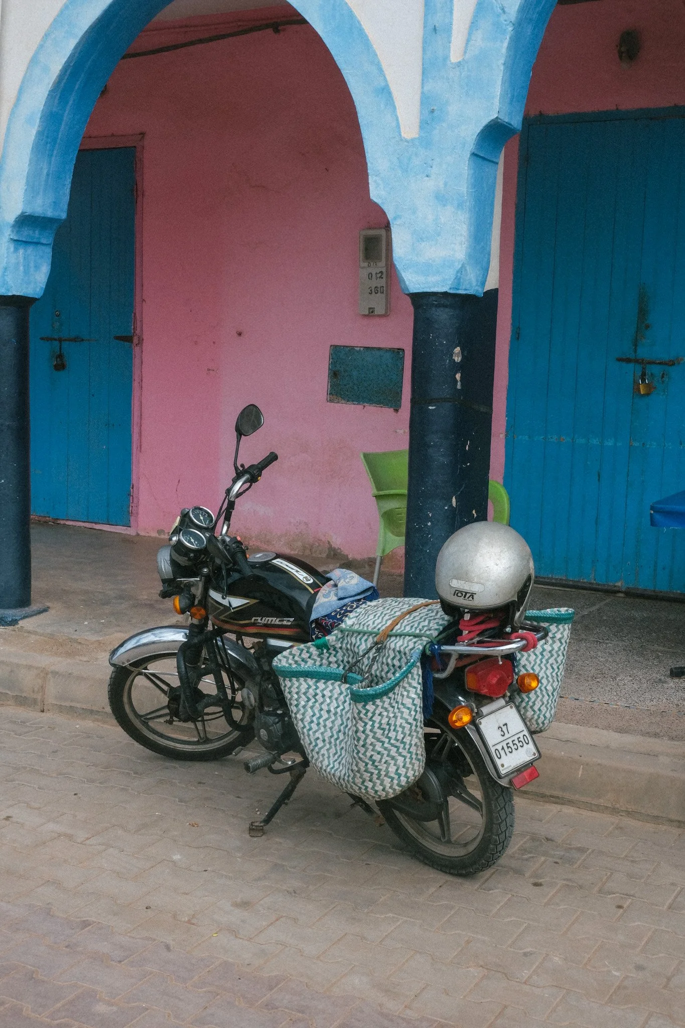 A motorbike and some beautiful colors in town.